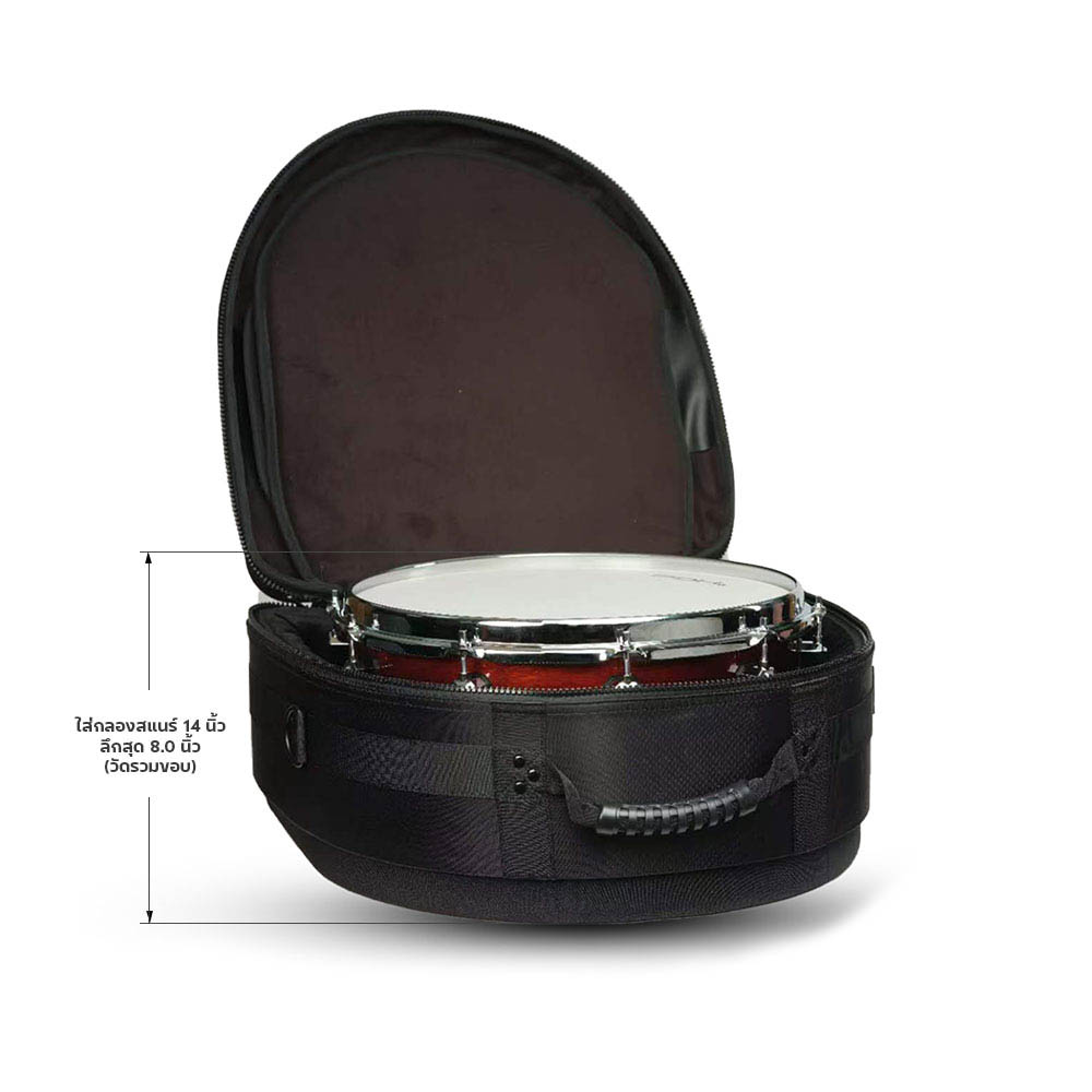 สิ่งสำคัญอันดับแรกคือต้องเลือกกระเป๋าที่มีขนาดพอดีกับสแนร์ กระเป๋าสแนร์ส่วนใหญ่จะระบุขนาดที่เหมาะสมไว้ เช่น 14″ x 5.5″ หรือ 14″ x 6.5″ ซึ่งหมายถึงเส้นผ่านศูนย์กลางและความลึกของสแนร์ การใช้กระเป๋าที่เล็กหรือใหญ่เกินไปอาจทำให้สแนร์เคลื่อนที่ไปมาภายในกระเป๋า และเกิดความเสียหายได้